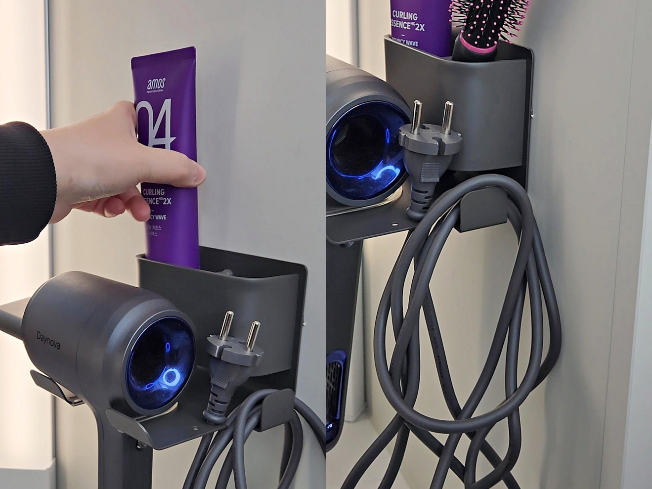 드라이기 뿐 아니라 머리빗, 헤어 제품까지 함께 보관할 수 있으며 업그레이드 된 최신형 제품에는 플러그 전용 거치대까지 추가되어 정리의 완성도를 높여줍니다.